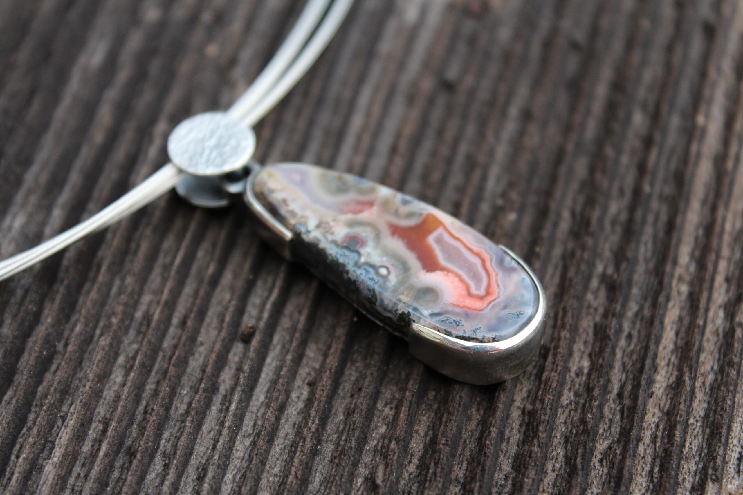 Der Anhänger mit einem Achat aus Marokko ist aus 925er Silber gefertigt. Durch die besondere Farbkombination des Achates weckt es die Neugier des Betrachters. Die Farben des Steines sind Grau, Blau und etwas Korallenrot. Am Kreis, wo die Kette durchläuft, sieht man den Hammerschlag. Seite und Rückseite sind gebürstet und der Fassungsrand ist hochglanzpoliert.