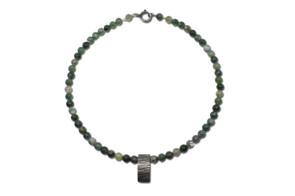 Eine sehr schöne Moosachat-Kette mit ca. 42 cm Länge und einem gebürsteten Federring Verschluss aus 925er Silber. Die Steinkugeln sind rund, etwa 7 mm im Durchmesser und sind auf Stahlseide gefädelt. Dieser Moosachat hat seinen Namen, weil er wie Moos aussieht und eine dunkelgrüne bis transparente Farbe aufweist. In der Mitte ist ein mit Hammerschlag strukturiertes Schmuckobjekt aus 925er Silber eingesetzt. Durch den zentrierten Schmuckzwischenteil wirkt die Kette sehr elegant.