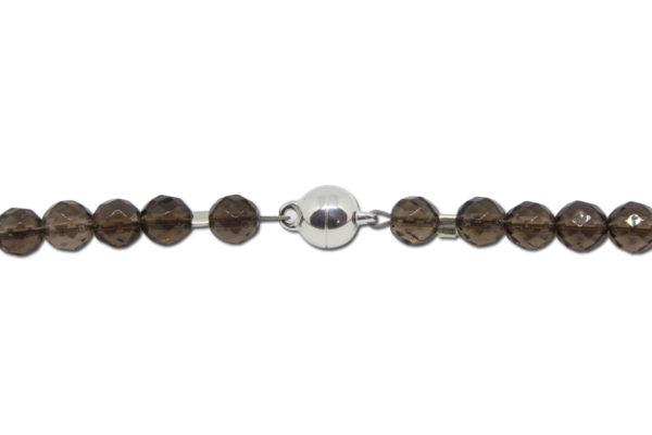 Eine elegante Rauchquarz Kette mit ca. 42,5 cm Länge und einer hochglanzpolierten Magnetschließe aus 925er Silber. Die Kugeln sind facettiert, etwa 6,5 mm im Durchmesser und sind auf Stahlseide gefädelt. An der Seite ist ein gebürsteter Silberring als Schmuckzwischenteil eingesetzt. Der Rauchquarz zeigt eine beruhigende braune Farbe.